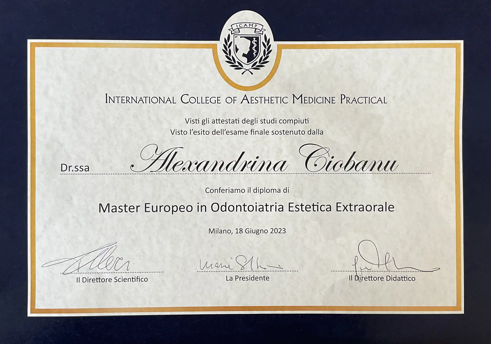 Nel 2023 ha ottenuto il titolo di Master in Odontoiatria Estetica Extra Orale dell’ICAMP College – Scuola Internazionale di Medicina Estetica Pratica a Milano e attualmente segue il corso di Master Universitario Internazionale Biennale di II Livello in Medicina Estetica e Terapia Estetica delle Università di Camerino e Torino.